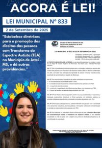 Desde o dia 2 de setembro, o município de Jateí conta com uma lei municipal que estabelece diretrizes para a garantia de políticas públicas à pessoa autista. É que a prefeita Cileide Cabral da Silva Brito assinou lei municipal 833/2025, para promoção de políticas públicas às pessoas com Transtorno do Espectro Autista (TEA).