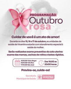 Com o tema “Cuidar de você é um ato de amor”, as unidades de saúde de Vicentina terão atendimentos especiais voltados à saúde da mulher, com exames preventivos, exames das mamas, vacinas de rotina e testes rápidos.