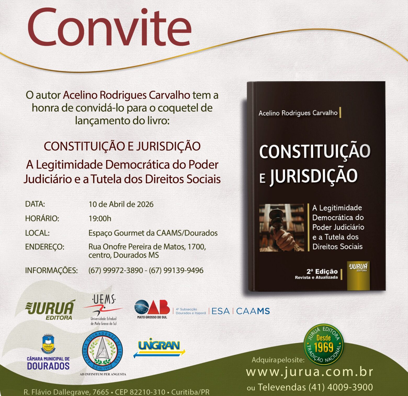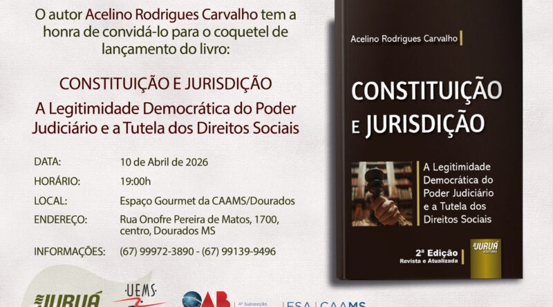 Depois do sucesso nos meios jurídico e acadêmico, o professor universitário Acelino Rodrigues Carvalho está lançando a segunda edição do livro “Constituição e Jurisdição: A legitimidade democrática do Poder Judiciário e a tutela dos direitos sociais”. Doutor pela Unisinos-RS e com estágio doutoral na Universidade de Coimbra, a edição revista e atualizada, mergulha no mundo do Direito, sob a ótica dos principais mestres, para uma análise pertinente e atual sobre a aplicação das leis e seu amparo constitucional.