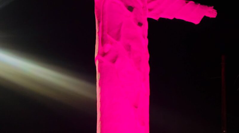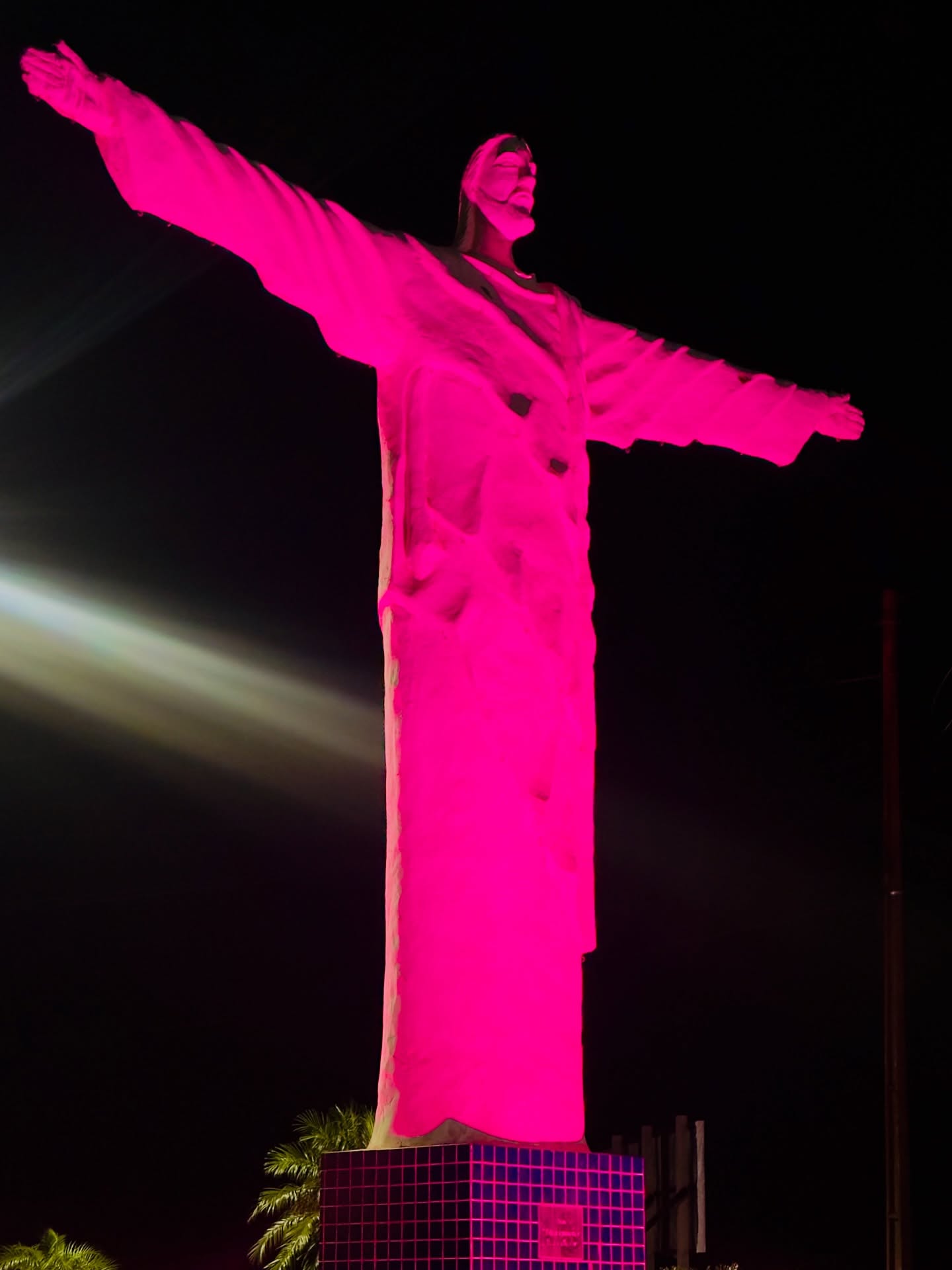 Cristo de Jateí é iluminado com a cor rosa, de prevenção e luta contra o câncer de mama