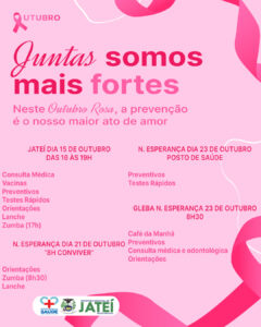 Programação – De 15 a 23 de outubro, o município de Jateí vai realizar diversas ações de prevenção e de atendimento às mulheres, com foco à prevenção ao câncer de mama. A programação começa dia 15 em Jateí, das 16h às 19h, com consulta médica, vacinas, preventivos, testes rápidos, orientações, lanche e zumba. No dia 21 de outubro, no distrito de Nova Esperança, terá orientações, zumba e lanche, a partir das 8h, no Projeto Conviver, sendo que no dia 23 haverá exames preventivos e testes rápidos no posto de saúde local.
