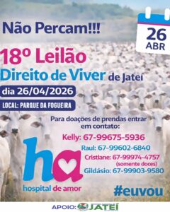 O município de Jateí se movimenta para realizar um evento beneficente tradicional, que é o Leilão Direito de Vicer, cuja renda é destinada para ajudar na manutenção do Hospital de Amor (Barretos), referência no tratamento ao câncer na América Latina e que também atende pacientes de Jateí. Neste ano, o leilão acontece a partir das 10h do dia 26 de abril, tendo como local o Parque da Fogueira.