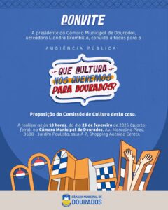 A Comissão de Cultura da Câmara Municipal de Dourados, presidida pelo vereador Franklin Schmalz (PT), realiza na próxima quarta-feira (25), às 18h, no Plenário da Casa, audiência pública com o tema “Que cultura nós queremos para Dourados?”. O encontro tem como objetivo debater a construção do Plano Municipal de Cultura, instrumento estratégico que irá orientar as políticas culturais do município pelos próximos dez anos, organizando metas, diretrizes e ações que impactam diretamente artistas, produtores culturais e toda a população.