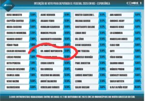 O delegado de polícia André Matsushita voltou a ser lembrado à Câmara Federal em nova roda de pesquisa de intenção de votos no Mato Grosso do Sul. Em sondagem realizada entre 1 e 7 de outubro em 30 municípios, o nome do presidente da Associação dos Delegados de Polícia Civil (Adepol/MS) foi novamente citado na modalidade espontânea, quando o eleitor responde sua intenção de voto sem que seja apresentado uma lista com nomes.