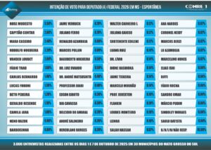 A pesquisa feita no começo deste mês aponta as intenções de votos para as oito vagas de deputados federais do Estado. Por encomenda da Rede de Rádios Top FM, terceira pesquisa realizada pelo Instituto Ranking Brasil Inteligência, foi realizada junto a 3 mil moradores com 16 anos ou mais de idade, em 30 municípios de MS. O intervalo de confiança é de 95% e margem de erro de 1,8 ponto percentual para mais ou para menos.