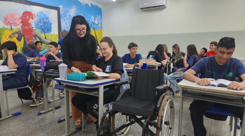 “Quando eu tinha 11 anos, descobri uma doença degenerativa e passei a precisar de cadeira de rodas. Aqui na escola, eu me sinto acolhida. Os professores sempre me ajudam, principalmente minha professora de apoio, que está comigo todos os dias. Eu gosto de vir para cá porque me sinto parte de tudo. Já aprendi muita coisa e estou mais confiante, minha professora de apoio me estimula e me motiva”, frisa.