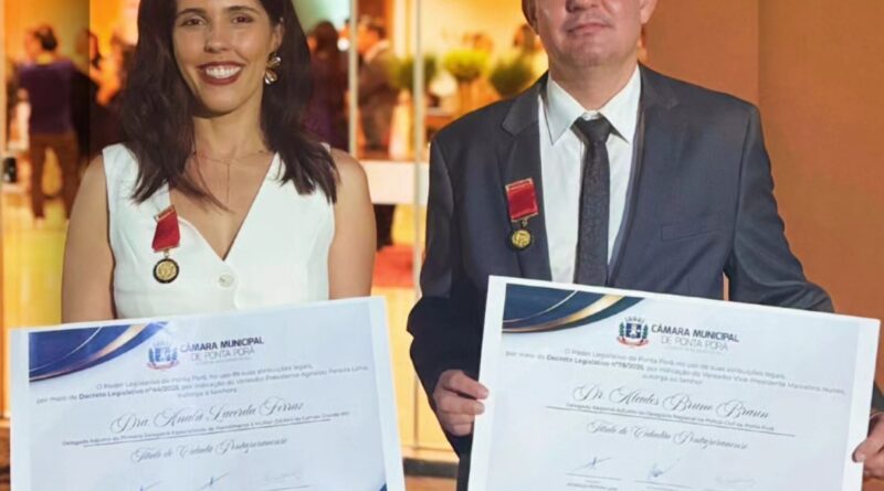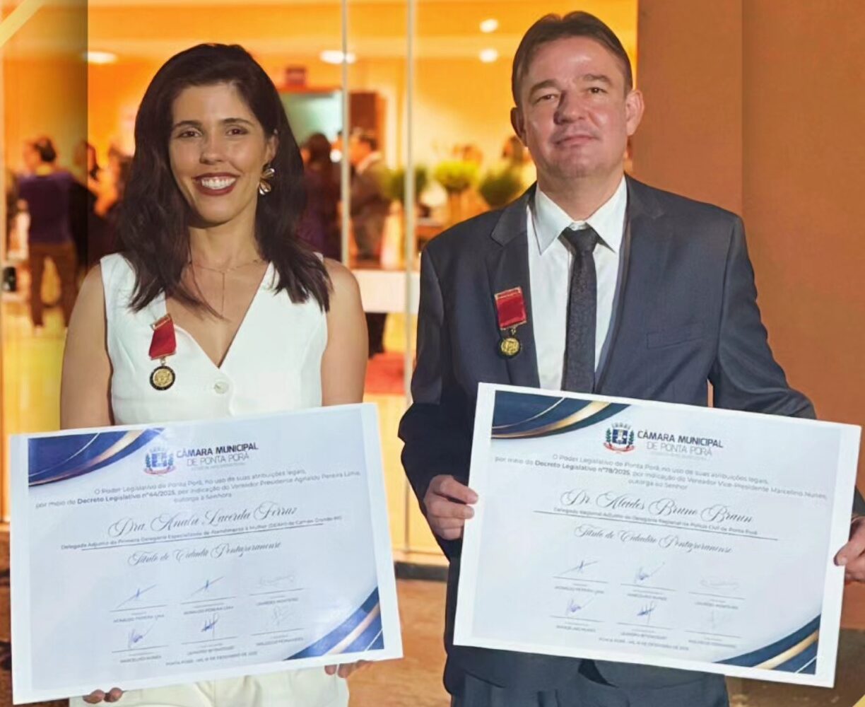 A Câmara Municipal de Ponta Porã realizou nesta semana sessão solene para homenagear personalidades que contribuem com o desenvolvimento do município. Entre as comendas entregues foi o título de Cidadã(o) Pontaporanense que, entre as pessoas contempladas, estavam a delegada Analu Lacerda Ferraz e o delegado Alcides Bruno Braun.