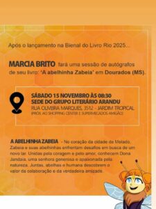 “A Abelhinha Zabeia”, obra da escritora e educadora douradense Márcia Brito lançada na Bienal do Livro Rio 2025, pousa em Dourados para um café da manhã repleto de delícias e poesia. O evento será sábado, a partir das 8h30m, prometendo ser leve, delicioso e inesquecível.