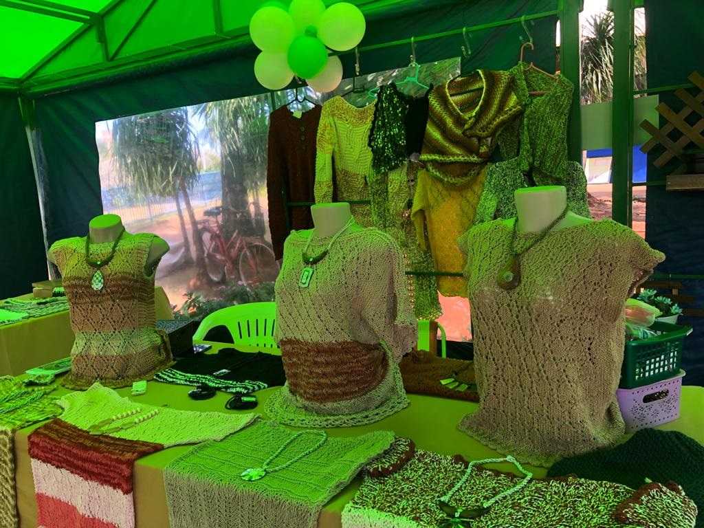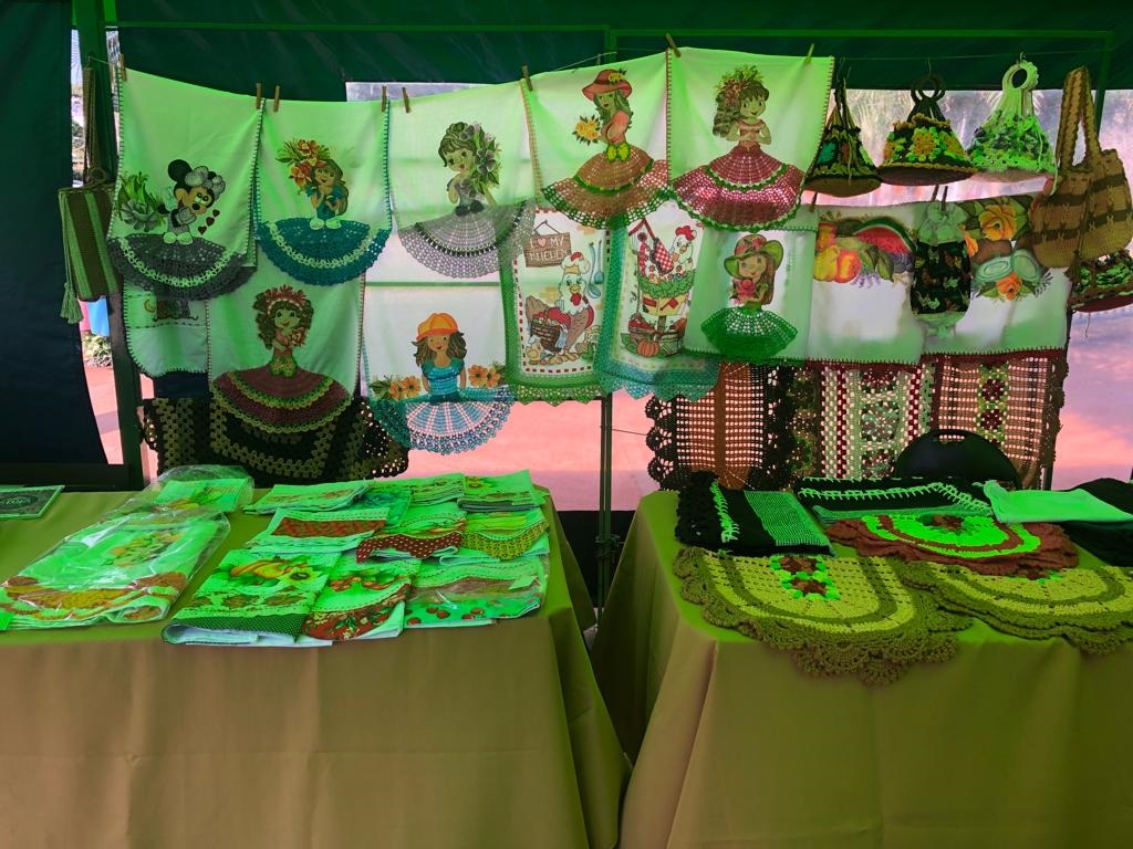 São 20 expositores no local e cor e arte chamam a atenção. Tapetes, panos de pratos, pesos de porta, bijuterias, peças de madeira e outros oferecidos a valores diversos.