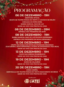 A programação oficial do Jateí de Natal de Luz 2025 começou neste sábado, dia 6, e vai até 20 de dezembro, com atividades na sede do município, no distrito de Nova Esperança e no Assentamento Gleba Nova Esperança.
