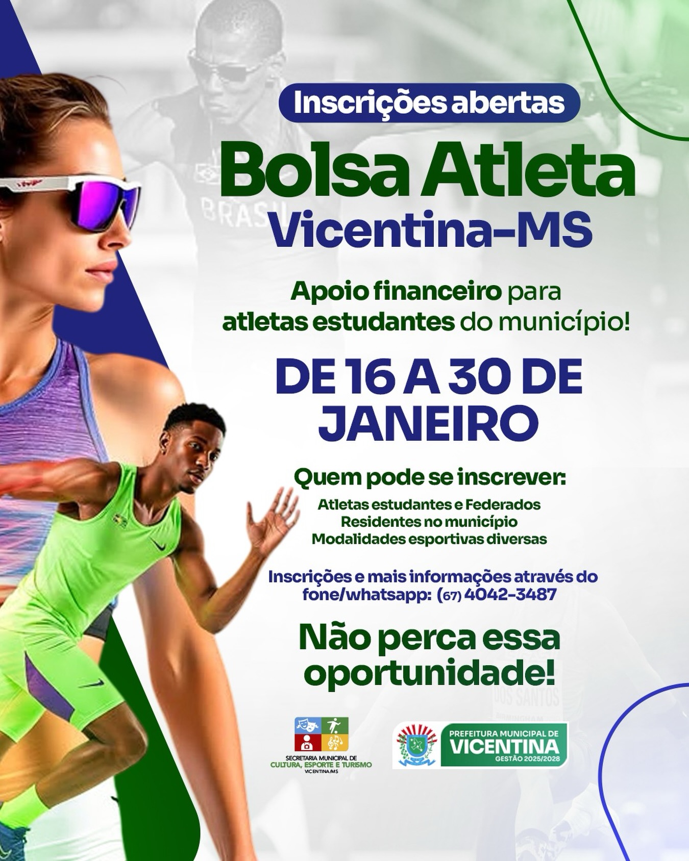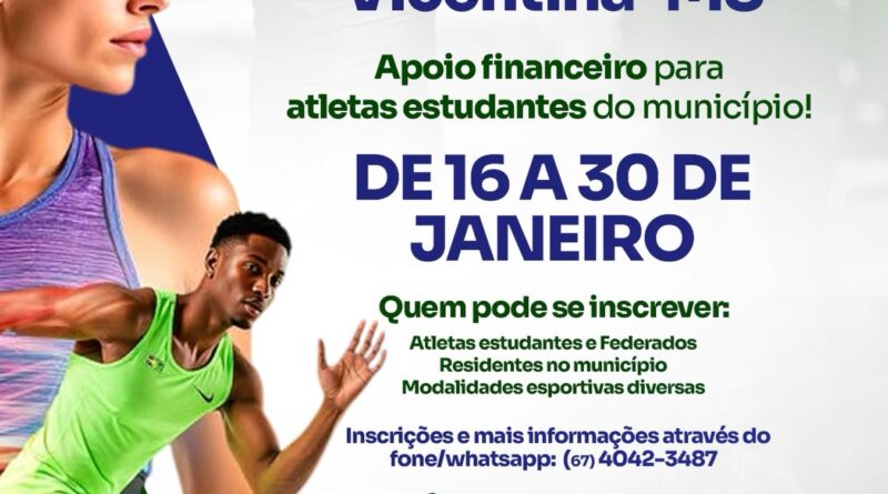 As inscrições ao programa ocorrem no período de 16 a 30 deste mês de janeiro de 2026 e uma condição é o atleta ser estudante. Além disso, é necessário fazer parte de organização esportiva que disciplina a modalidade. “É a chance de quem compete e estuda e que reside em Vicentina receber apoio financeiro para continuar treinando, competindo e representando nosso município”, assinala a Secretaria Municipal de Esportes.