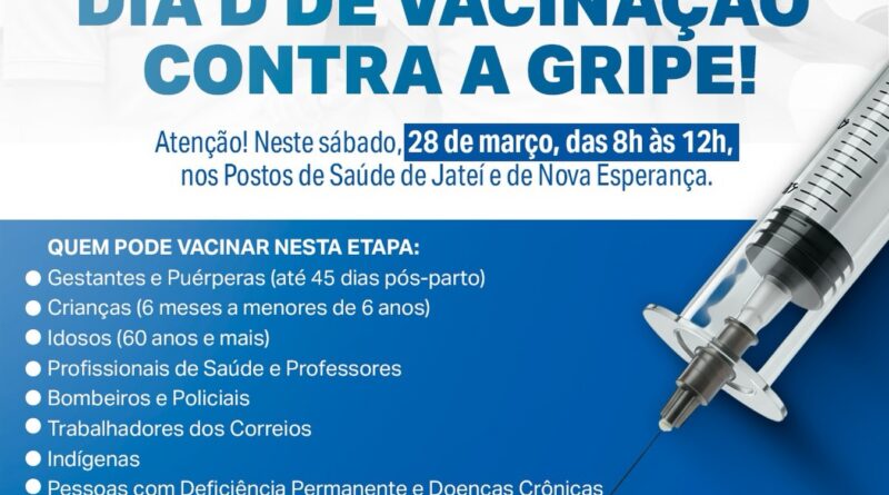 A Prefeitura de Jateí vai promover o Dia D de vacinação contra a gripe no próximo sábado, dia 28 de março. A ação coordenada pela Secretaria Municipal de Saúde vai acontecer nos postos de saúde da sede do município e do distrito de Nova Esperança.