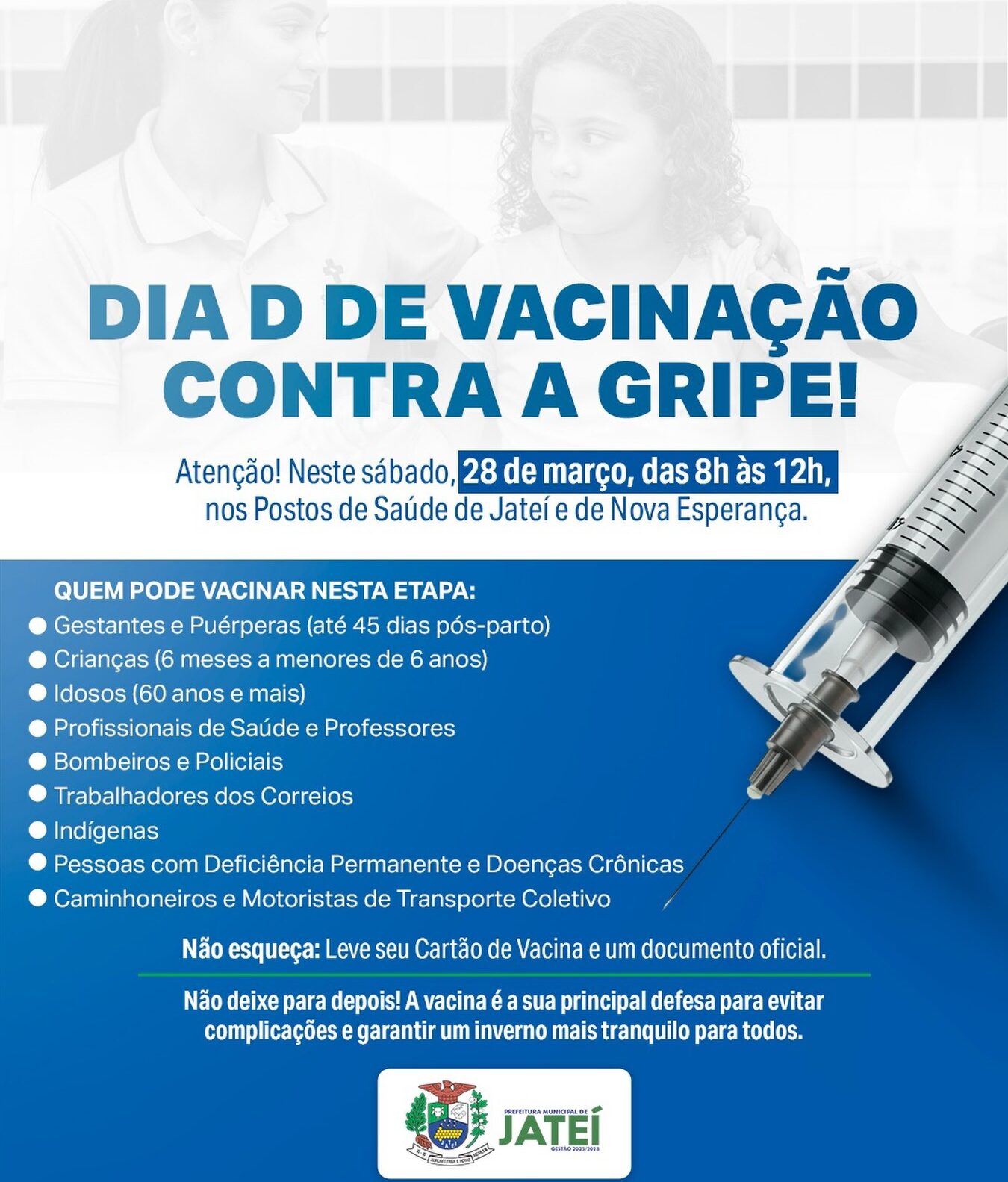 A Prefeitura de Jateí vai promover o Dia D de vacinação contra a gripe no próximo sábado, dia 28 de março. A ação coordenada pela Secretaria Municipal de Saúde vai acontecer nos postos de saúde da sede do município e do distrito de Nova Esperança.