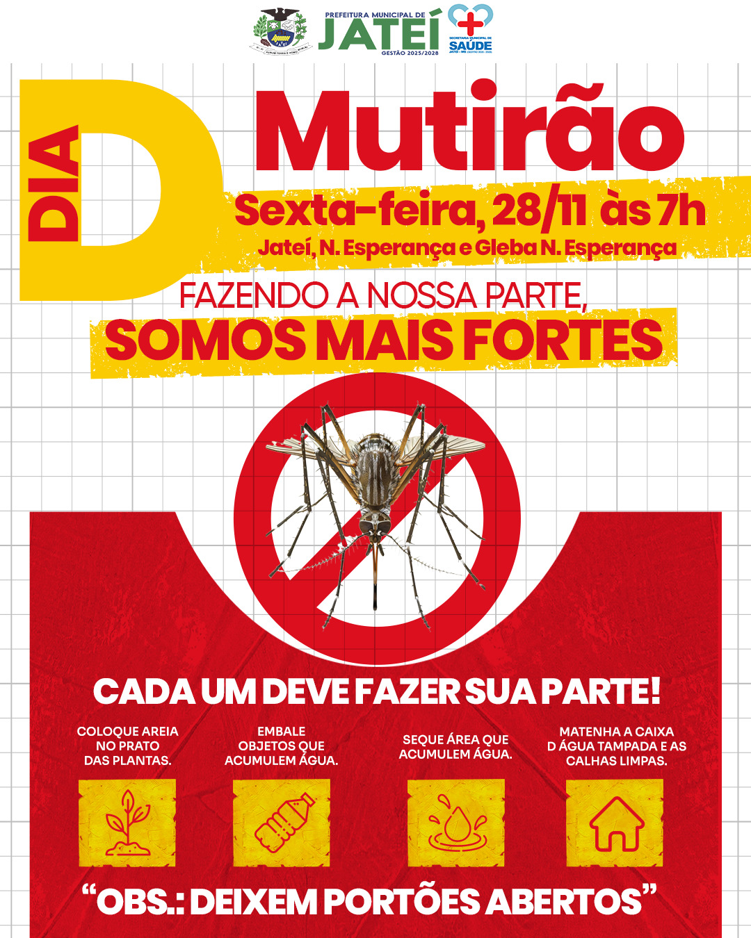 Nesta sexta-feira, dia 28 de novembro, uma grande mobilização está sendo organizada na sede do município, no distrito de Nova Esperança e no Assentamento Gleba Nova Esperança. O mutirão de combate ao mosquito transmissor começa às 7h, com o objetivo de reforçar a prevenção e eliminar possíveis focos do mosquito transmissor da dengue, zika e chikungunya.