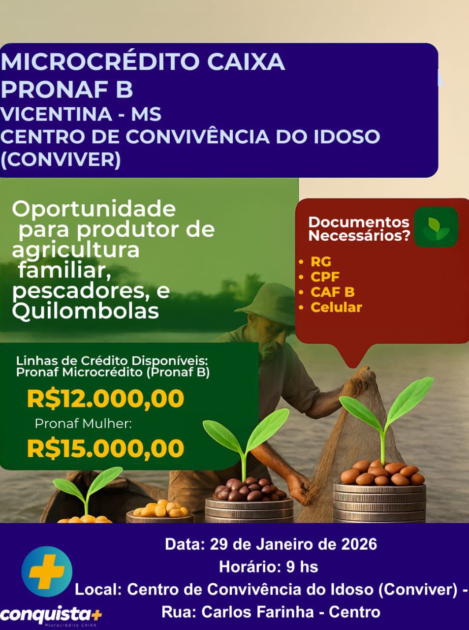 A Caixa Econômica Federal (CEF) realiza neste dia 29 de janeiro, em Vicentina, um mutirão do microcrédito para as familias interessadas em participar do programa Nacional de Agricultura Familiar (Pronaf B). A presença da instituição no município visa a liberação de crédito, para homens e mulheres, que se enquadram dentro do programa e queiram buscar recursos para alavancar a produção na agricultura familiar.