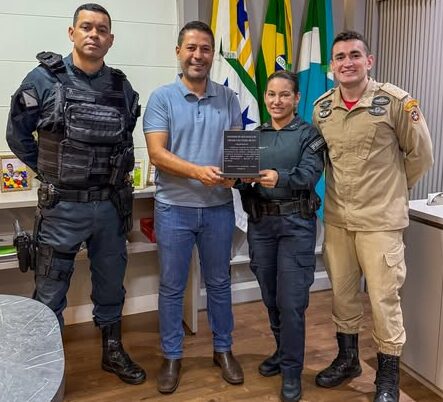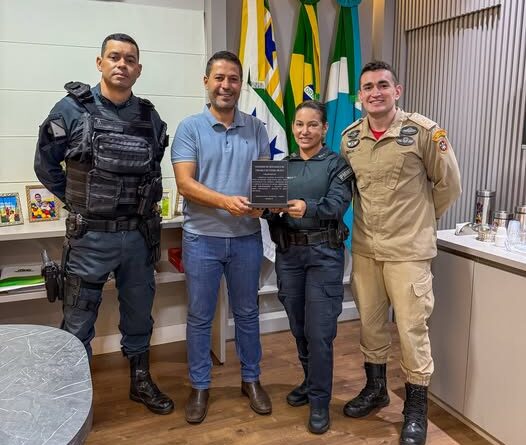 A homenagem foi entregue por Gabriela Fernandes, tenente coronel que comanda o 14º Batalhão da Polícia Militar e que preside o Conselho de Segurança. A entrega aconteceu no gabinete do prefeito e foi acompanhada por Willian Douglas Santos, capitão comandante do 2º Grupamento de Bombeiros Militar e que é vice-presidente do Conselho. O momento também foi presenciado por Rivaldo Dias, subtenente responsável pelo pelotão PM em Vicentina (foto).