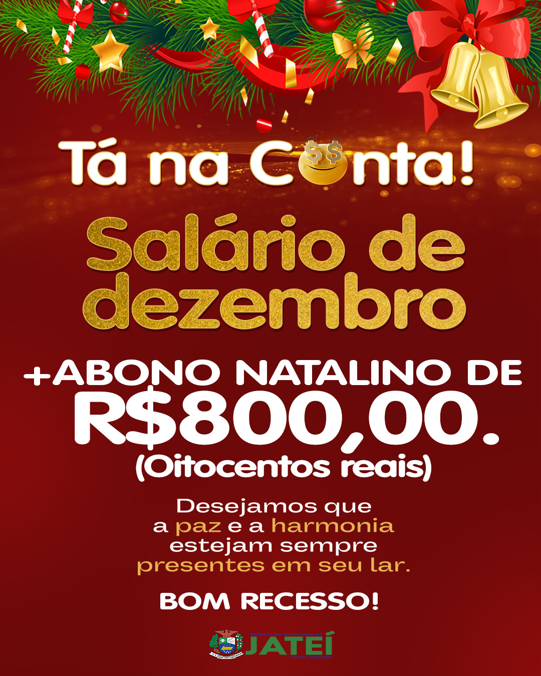 A Prefeitura de Jateí anunciou nesta sexta-feira (19) a antecipação do pagamento do mês de dezembro ao funcionalismo municipal. Além do salário, a atual gestão municipal anuncia também o pagamento de um abono salarial de final de ano no valor de R$ 800,00.